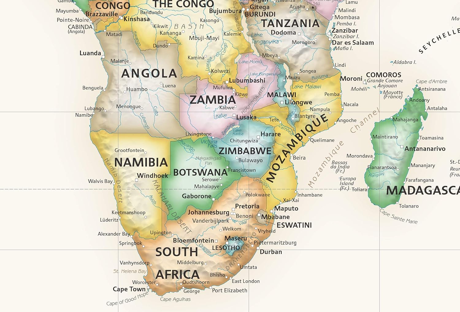 BEAUTIFUL POLITICAL WORLD MAP with updated country, city, and place names. Countries are presented in bright, contrasting colors. It adds character, charm, and an educational flavor to any living room, study, office, or kid's room. People who like watching the news or keep up on current events love this map as does anyone with an appreciation for inspiring art. You will find yourself returning to is over and over to recharge your energy, good mood, and ideas. The map is self sticking requiring no tape, nails, or glue. Simply peel and stick. It's easy to reposition or remove. It will not mark or leave residue on walls. PRODUCT FEATURES: Political World Map Mural Peel and stick, easy application Simple to reposition or remove from wall Will not harm walls or leave sticky residue Features a classic blue ocean world map color theme Adds a pop of color to any interior space Choose from a variety of sizes available Durable materials with quality printing will last and look good for years MADE IN THE USA in small batches to ensure top quality product. Many people love this map so much they return to buy another to give as a gift. Get yours today!