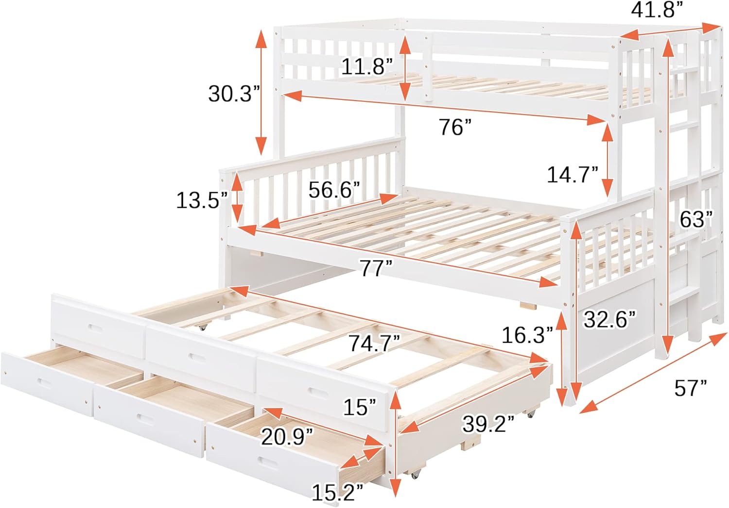 Welcome to shopping with us. Your satisfaction is our greatest motivation. If you have any problems, Please feel free to contact us. We will try our best to make you satisfied. If you need extra sleeping space or your kids love sleepovers, this Twin-Over- Full Bunk Bed with trundle and storage drawers is perfect for your home. The trundle bed under the bottom bed makes this piece a great option for sleepovers. Three drawers under the trundle bed provide ample storage for your little ones' toys and bedding. High-quality, solid pine legs and a strong, durable frame ensures stability and durability for long-term use, Can be divided into a full captain bed with 3 drawers and a single twin bed .This easy conversion is super handy to adapt to your growing kids. Slat kit included so box springs are not required. This bunk bed twin over full size with storage is designed with a clean silhouette and a hue of elegance.It suits all styles of home decoration, and completes the look of any bedroom. Description Material: Pine wood+MDF Size: Twin-Over-Full Color: Espresso/White/Grey Function: with Trundle/ Drawers Decoration: Bunk bed numbers of package: 3 Spring box: No need Assembly Required: Yes Dimensions Overall Product Dimension: 77"L x 57"W x 63"H Overall Product Weight: 173lb Weight capability: Upper bed: 300 LBS Bottom bed: 350 LBS Trundle bed: 300 LBS Number of Upper/Down/Trundle Slats: 14/14/7pcs Recommended Mattress Thickness: Upper bed: 6" Bottom bed: 8" Trundle bed: 6" Mattress included:NO Notes: Manual measurement has been used,there may be some reasonable error. All the pictures are taken by actual samples, slight chromatic aberration may occur due to lighting or display.
