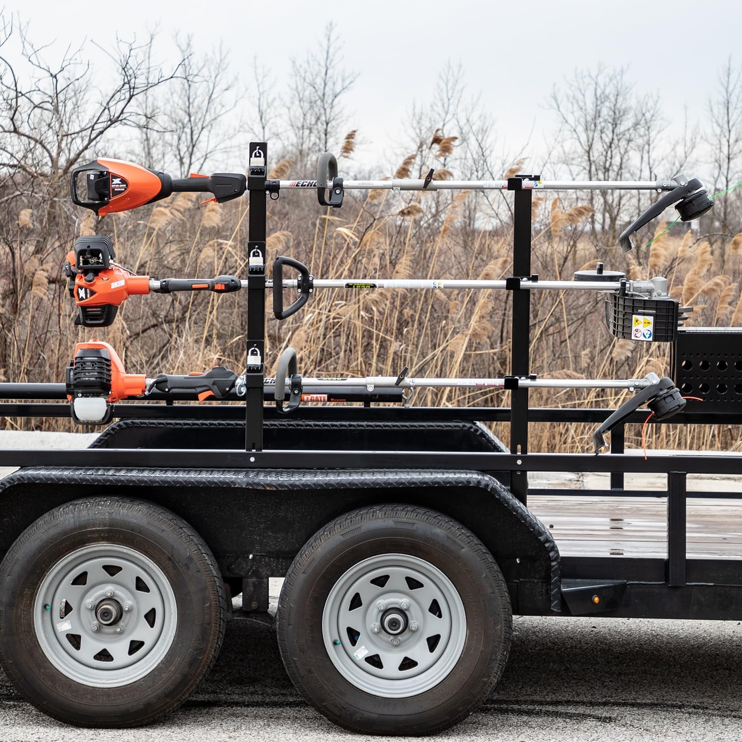 Buyers Products Lockable Trimmer Racks mount to any open style landscape trailer. They keep your trimmers secure and your trailer organized. The hinged latch included padlocks to secure the trimmers in place and help deter theft. The rack features sturdy steel construction with a corrosion resistant black powder-coated finish. Mounting hardware is included.