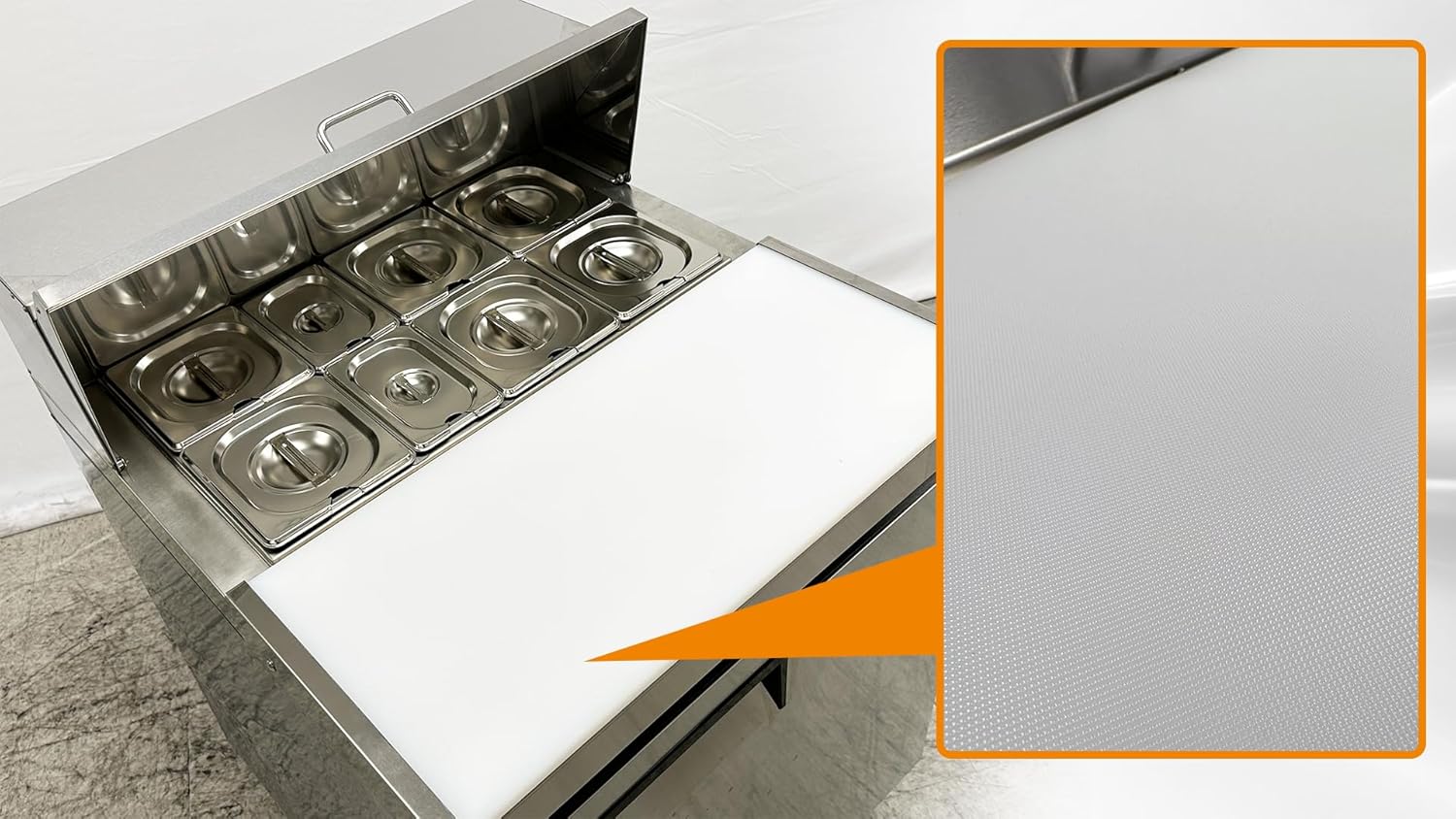 Commercial Refrigerated Sandwich Prep Table 1-door 28 ins Stainless Steel Merchandise Cold Salad NSF ASR-0776 This Sandwich Preparation Table has an overall dimension of 27 inches Wide X 29 inches Depth X 42 inches Height. The construction of this unit is designed with commercial use in mind. It features a 430 type stainless steel exterior and 304 type stainless steel interior, which are fortified with foamed-in-place polyurethane insulation. The insulation also helps to promote proper temperature retention. For operation, the prep table requires a 115V electrical connection. REFRIGERATED STORAGE: Beneath the workspace is additional 7.2 cuft One doors storage space. Because it's refrigerated at temperature of 33°F to 41 °F ( or 0°C to 5°C), the space is great for storing back-up ingredients, such as deli meat and cheese, as well as less common toppings. The epoxy-coated shelves are included and can each accommodate up to 90 lb. of weight, helping to organize your assorted supplies INSULATED LID: A stainless steel insulated lid encloses the top to maintain proper, food safe temperatures. It features a lift-up design for fast and easy use.CASTERS INCLUDED: Four heavy-duty 4" casters (2 locking) are also included providing the unit with convenient mobility, making cleaning and servicing a breeze! Just roll the unit away from the wall. CUTTING BOARD SPACE: An industry-best 3/4" thick cutting board is mounted to the table surface, providing a reliable place for slicing ingredients and assembling orders. It can even be removed for easy cleaning or swapped out with another board of your choosing.