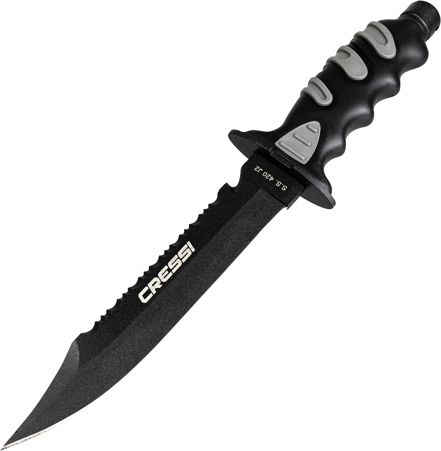 Strong and versatile professional knife. Japanese tempered AISI 420 stainless steel with black coating blade. The duration of these features is guaranteed not by the sharpness itself, but by the quality of the material that guarantees the durability of the blade. Rhomboidal cross section for greater resistance to flexing and breaking. Double-edged blade with one smooth-edged side and the other serrated. Includes a safety rope cutter to quickly cut nets and fishing line. The blade extends through the interior of the handle and, at the end of the handle, has a small pommel. Comfortable handle with rubbery Soft Grip polymer coating. Plastic sheath, very hydrodynamic with a rubber ring knife attachment. Belt and calf attachment using two elastic straps (included). The Giant is designed in Italy by Cressi and made in China. Cressi has been an Italian brand pioneer in scuba diving, snorkeling, and swimming equipment since 1946. The product is covered by a 2-year limited warranty.
