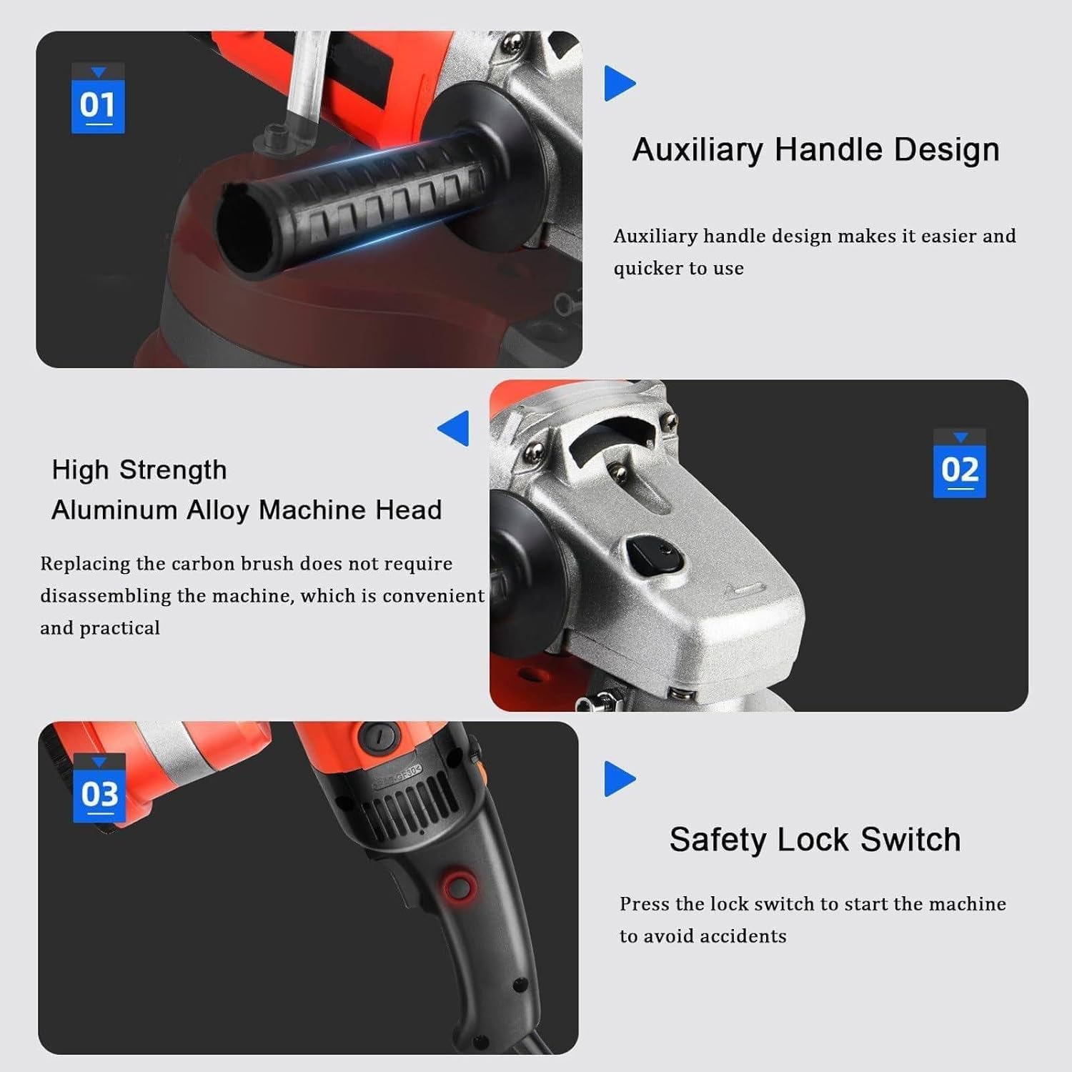 This grinder with three heads has an ergonomic auxiliary handle design and a high-strength aluminum alloy head for easy grinding on various sur-faces like concrete.Variable speed angle grinder can faster material removal ideals for all types of stone like concrete, ceramic, tile, marble, granite, rock, cement, etc.This grinder features a large-diameter granule discharge outlet for use with an external dust collector, creating a cleaner working environment and enhancing user comfort and efficiency.◮ Specification:Product name: Industrial three-head grinderRated voltage: 110V/220VNo-load speed: 2800r/minMotor power: 3000WFrequency: 50HZGear adjustment: 6 gears adjustmentGrinding disc diameter: 20CMPacking size: 55.5*37.5*22.5CMGross weight: 7.5KG◮ Package Includes:1 * Concrete grinder3 * Polishing pads3 * Sandpaper3 * Adhesive disc3 * Diamond disc. You don’t need to buy additional accessories,can be used directly for polishing work.