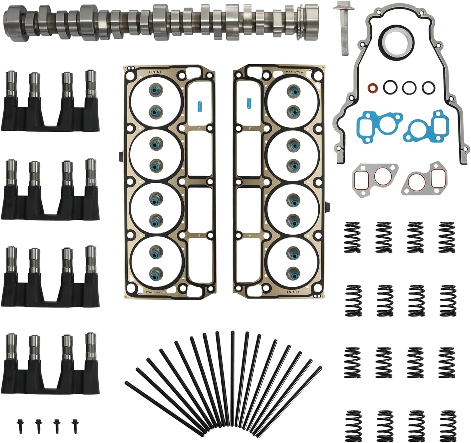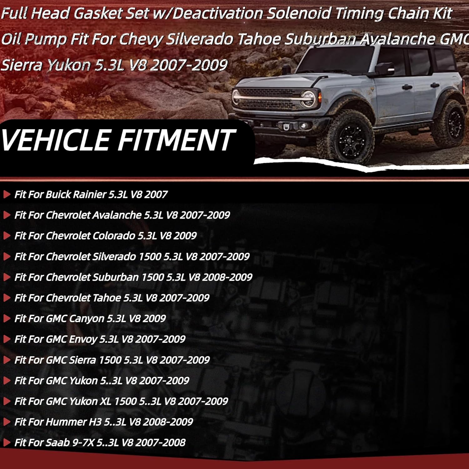 Vehicle Fitment: Fit For Buick Rainier 5.3L V8 2007; Fit For Chevrolet Avalanche 5.3L V8 2007-2009; Fit For Chevrolet Colorado 5.3L V8 2009; Fit For Chevrolet Silverado 1500 5.3L V8 2007-2009; Fit For Chevrolet Suburban 1500 5.3L V8 2008-2009; Fit For Chevrolet Tahoe 5.3L V8 2007-2009; Fit For GMC Canyon 5.3L V8 2009; Fit For GMC Envoy 5.3L V8 2007-2009; Fit For GMC Sierra 1500 5.3L V8 2007-2009; Fit For GMC Yukon 5..3L V8 2007-2009; Fit For GMC Yukon XL 1500 5..3L V8 2007-2009; Fit For Hummer H3 5..3L V8 2008-2009; Fit For Saab 9-7X 5.3L V8 2007-2008 OE Part Number: Head Gasket Set:C325HSB; TIming Chain Kit:33SRH60SB; Oil pump:M295; Cylinder Deactivation Solenoid:12571609; Timing Crank Sprocket:12556582,8125565820; Timing Chain:12552954, 12586482,12646386,12646387, 8125864820,8126463860,88958608 Timing Chain Tensioner:12585997, 12626407; Timing Cam Sprocket:12591689; Water Pump:AW5140 Package Includes: 1x Head Gasket Set; 1x TIming Chain Kit; 1x Oil pump; 1x Cylinder Deactivation Solenoid; 1x Timing Crank Sprocket; 1x Timing Chain; 1x Timing Chain Tensioner; 1x Timing Cam Sprocket; 1x Water Pump