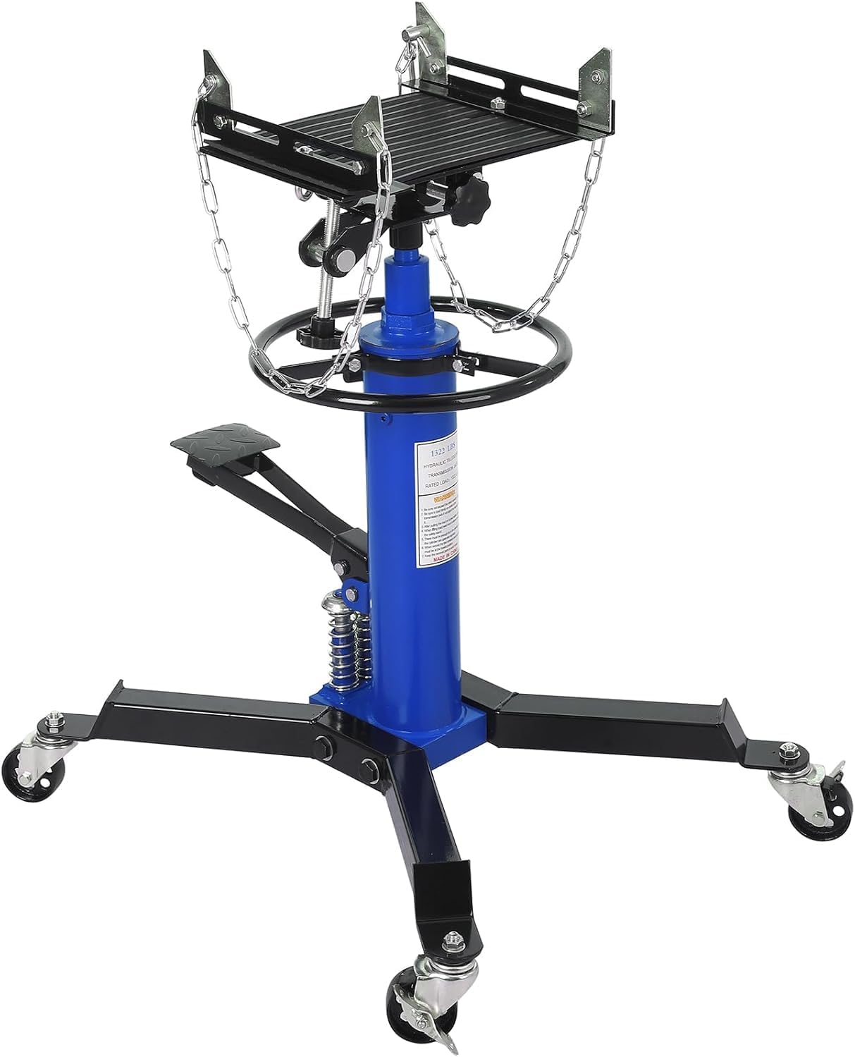 Heavy-duty 1322 lb (1/2 ton) capacity for safe transmission handling2-stage hydraulic telescoping lift (33.8" to 72.8" height range)Foot pedal operation for effortless lifting, handle-controlled lowering30° tilt-adjustable saddle with secure bolt positioningPremium steel construction for maximum durabilityFour 360° swivel casters with central pull ring for easy mobilityLocking wheels ensure stability during useIdeal for car/truck transmissions in garages or industrial shops