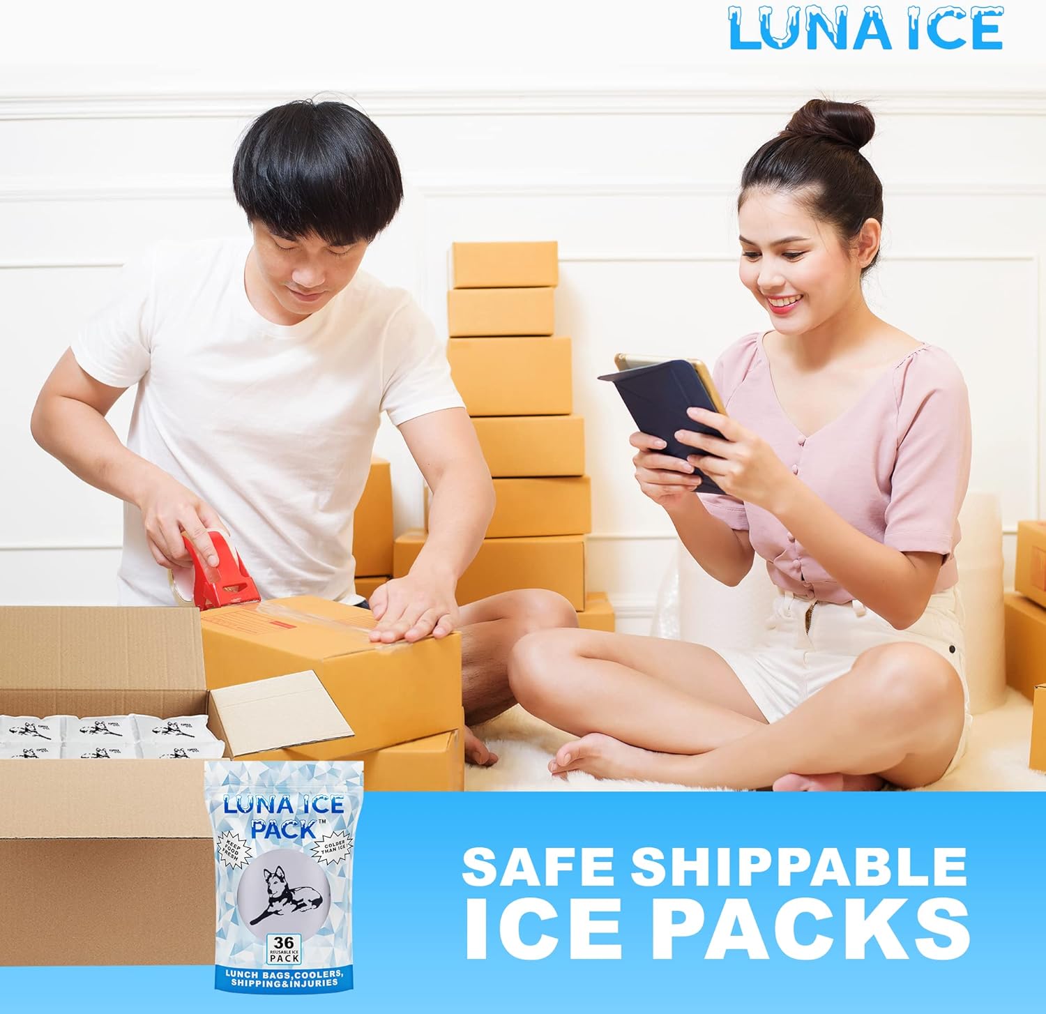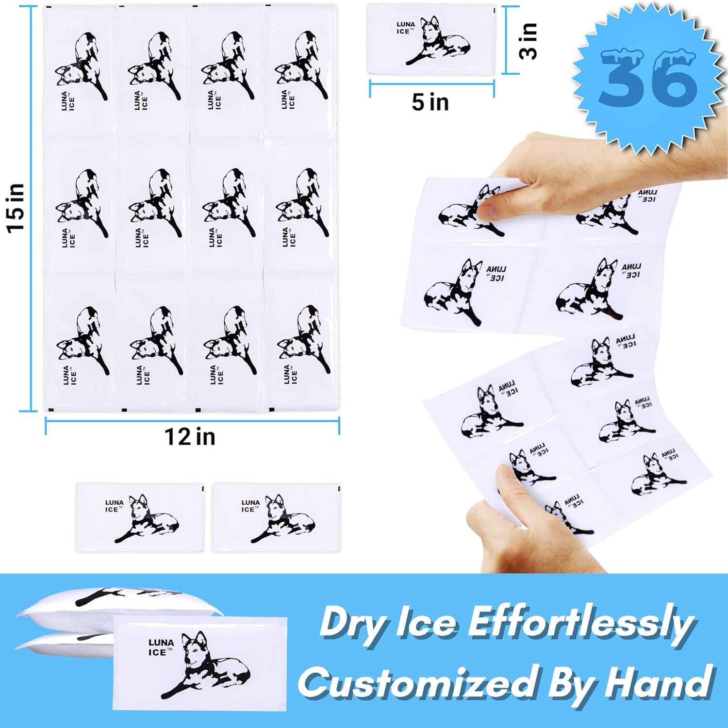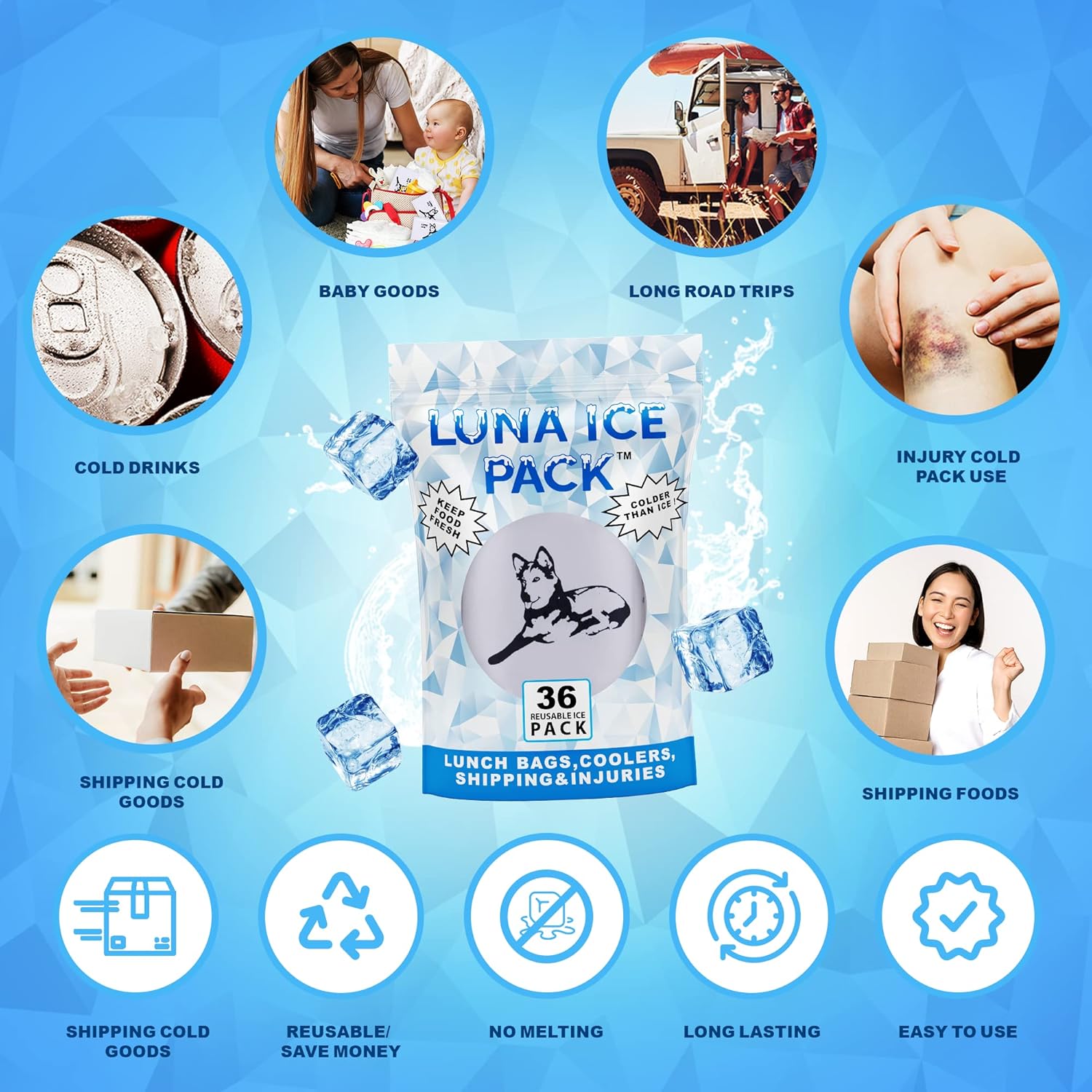 Luna Ice Gel Ice Packs Bundle 636 Pack - Dry Ice for Shipping Frozen Food, Lunch Bags & Injuries Get ready for the next level of cold with Luna Ice Packs. Our dry ice packs for shipping can be used in lunch boxes. Designed to be long-lasting for shipping frozen food, packing coolers, and more. By simply soaking in water and freezing overnight, these freezer packs will last up to 72 hours in an insulated cooler. Our multifunctional ice sheets can even be used for injuries. Whether it’s for neck pain, back pain, or a quick spill on the playground, Luna Ice can help speed up recovery time.. Our 636 bulk ice packs contain 53 12”x15” ice sheets that are all lightweight, foldable, and convenient for every situation. We’ve designed these shipping ice packs to be compatible with any insulated containers, coolers, and lunch bags, along with shipping boxes, styrofoam shipping containers, and cold bags. Our dry ice packs are the perfect way to ship frozen food and perishables. At home, these ice sheets for food allow you to keep your lunch cold all day with their convenient, easy-to-use flat shape. Luna ice packs for shipping is the ultimate dry ice packs for shipping food These premium cold packs for shipping offer the best temperature control for any sized bag and cooler. We believe that reusable ice packs should fit easily in foam coolers and should be customizable for everyday needs like travel, picnics, aches, and pains. Our leak-proof gel ice packs are mess and stress free since you can use them again and again. Luna Ice is food grade, non-toxic and extremely portable while remaining functional and versatile enough to use as dry ice for shipping frozen food. We’ve made Luna Ice to be the ideal solution for your breakable ice packs and shipping needs alike.