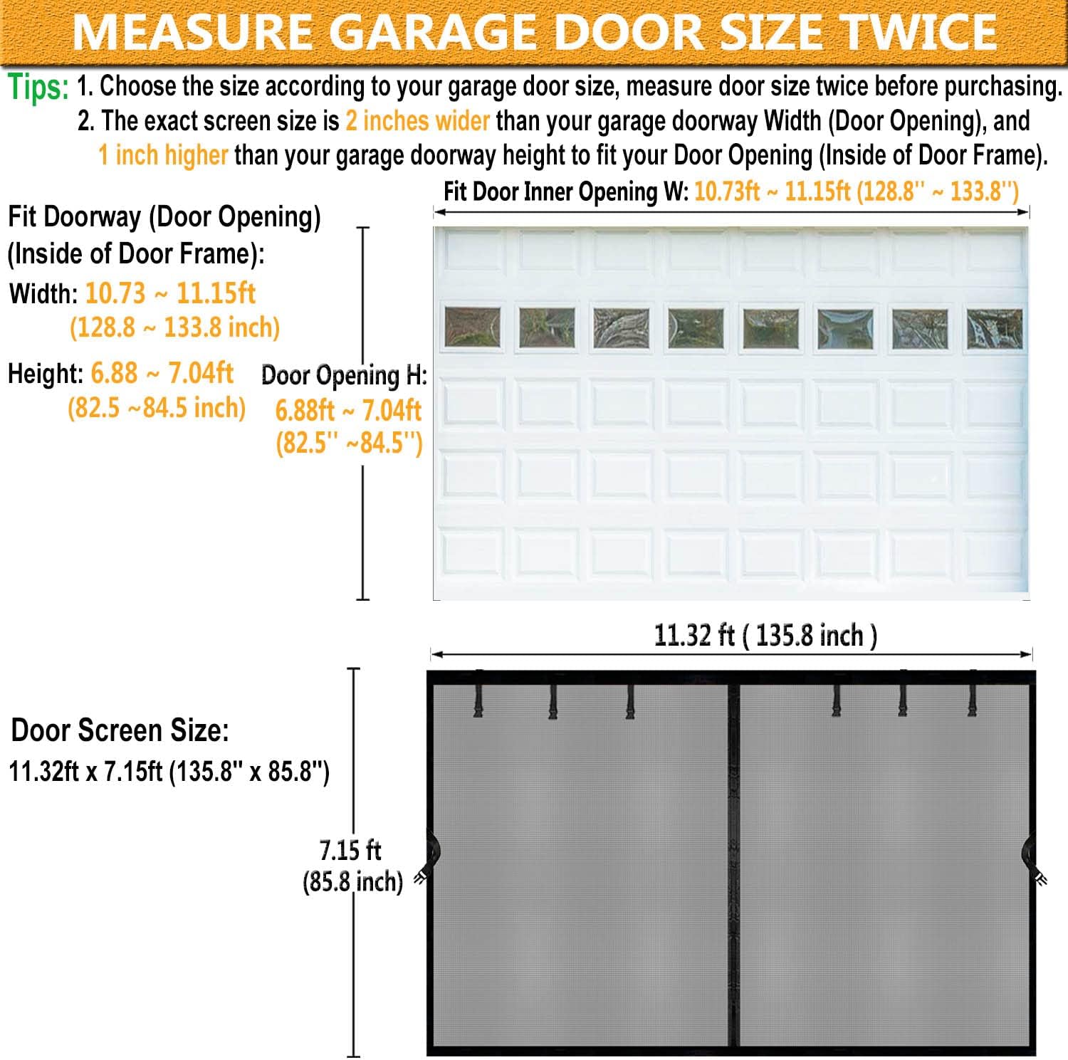 • 11x7ft meganetic screen: Our garage screen door fits for 11x7ft garage doors, magnetic screen door net size is: 11.3x7.17ft, please reverse extra length and width for door frame, please measure of your garage doors twice before purchase screen door curtain mesh. The garage screen door mesh installation is very easy, no need other tools, just take minutes, then you can install the retractable garage door screen. Convenience and fast. Also, when it is off-season, you can remove the meganetic screen mesh and store it very easily.