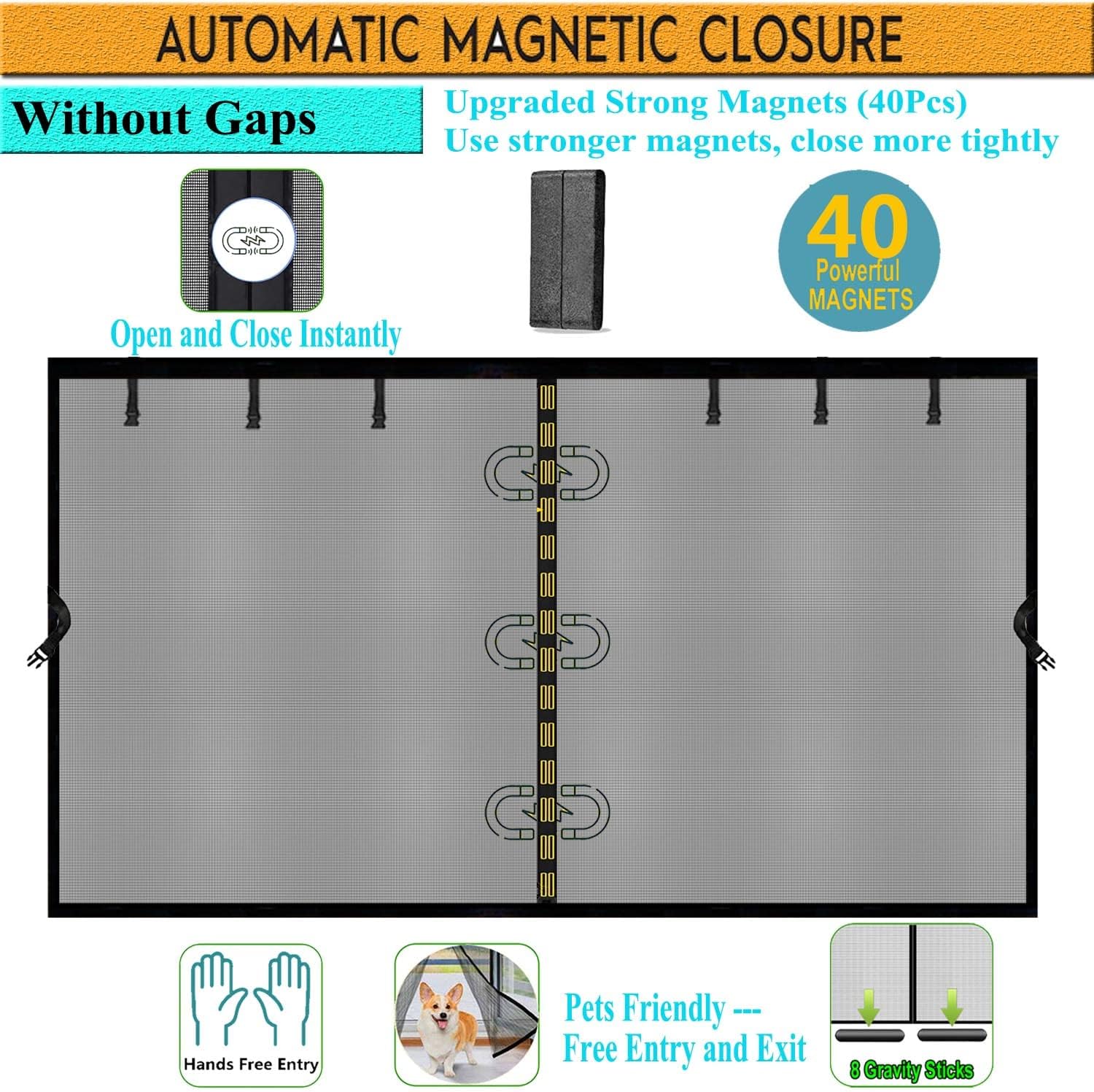 • Upgraded version: We upgrade the velcro of the magnetic screen door to 4cm on the top, it increase the load-bearing capacity of the Magic Tape, the retractable screen door will not easy to drop. There are 36 pairs of strong magnets, it can keep the door screen magnetic closure heavy duty closed all time, no bugs can go in through door screen magnetic closure. We weighted at the bottom of the screen porch curtain kit for a long-lasting draping effect.
