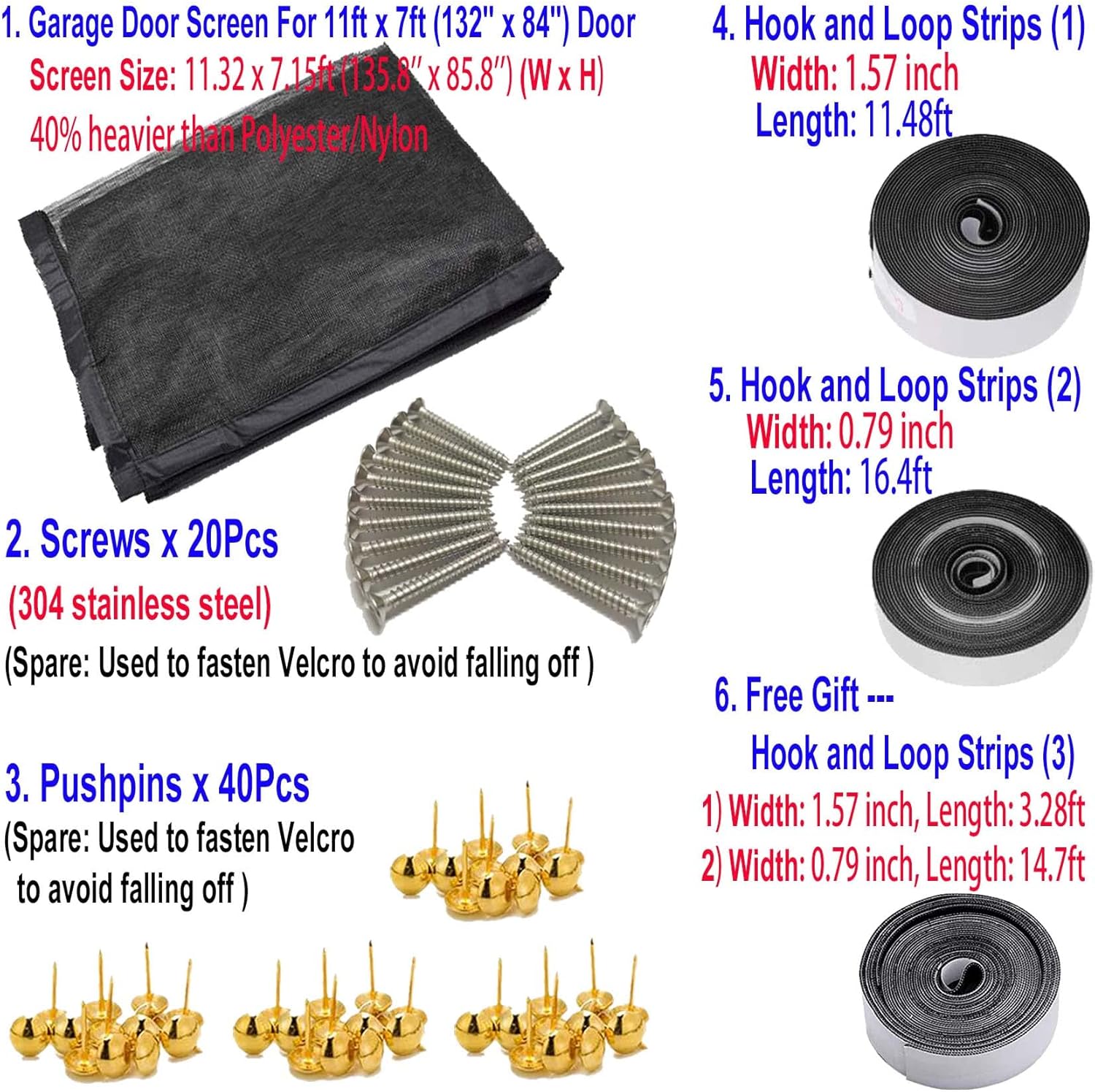 Included Components 1 x Garage Door Screen, 20 x Stainless Steel Screws, 3 x Rolls Hook Strips (with Adhesive), 40 x Pushpins, 6 x Storage Belts