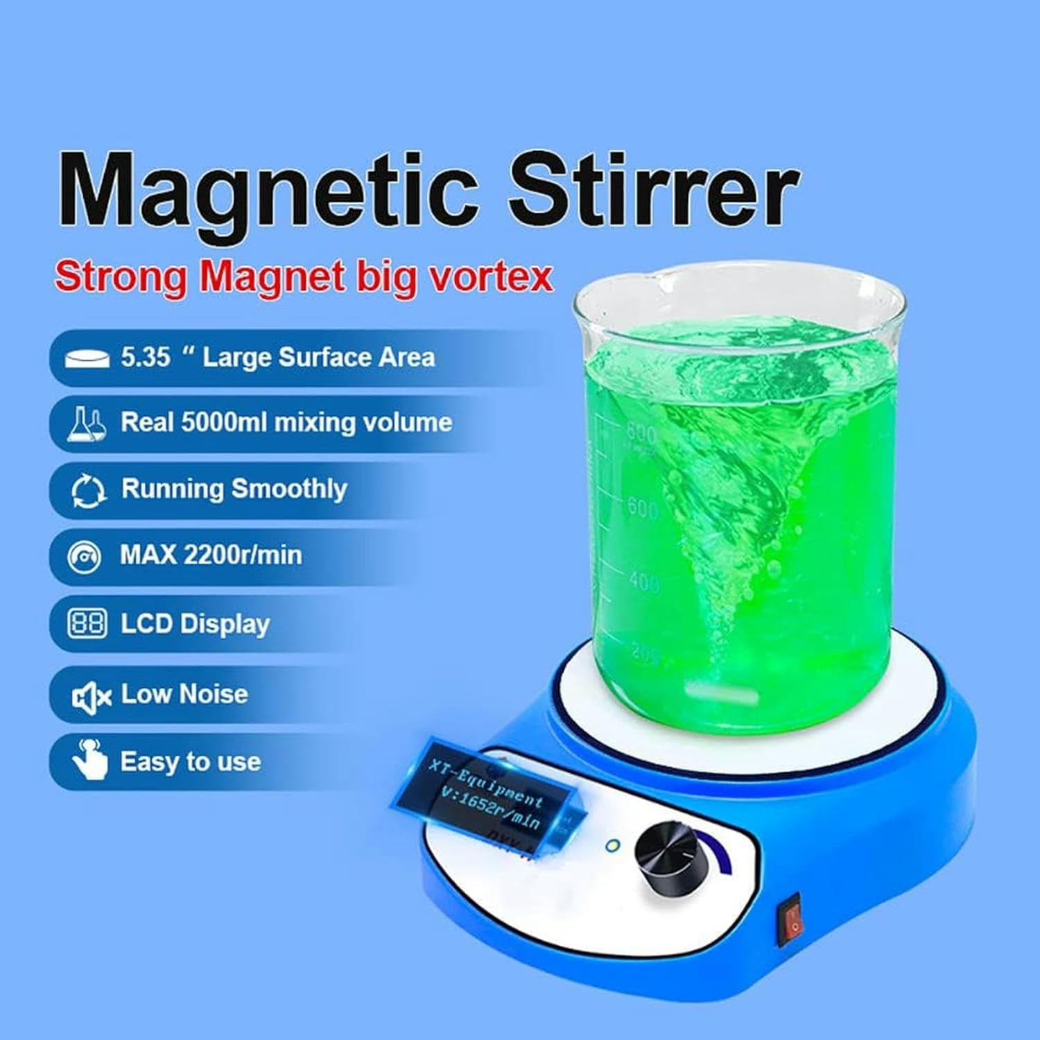 Features: 1. Integral injection molding process, with the advantages of compact size, lightweight and strong support. 2. Low power consumption, silent, strong magnetic force and other characteristics. 3. Power supply using 100-240V power supply, suitable for most countries around the world. 4. Beautiful appearance, the panel is composed of brushed 304 stainless steel articulation, strong anti-corrosion ability. 5. The shell has a waterproof function, when in the stirring without worrying about spilling liquid to damage the instrument, and easy to clean. 6. With digital display speed function, which can display the current stirring speed in real time. Specification: Power supply: AC100-240V 50/60Hz Power supply voltage: 8V 2A power adapter Stirring capacity: 5000ml (water) Stirring speed: maximum 2200 rpm Magnet size: C8*35mm Size: 202*1 60*50mm Stirring size: φ136mmPacking list: LED Digital Magnetic Stirrer*1
