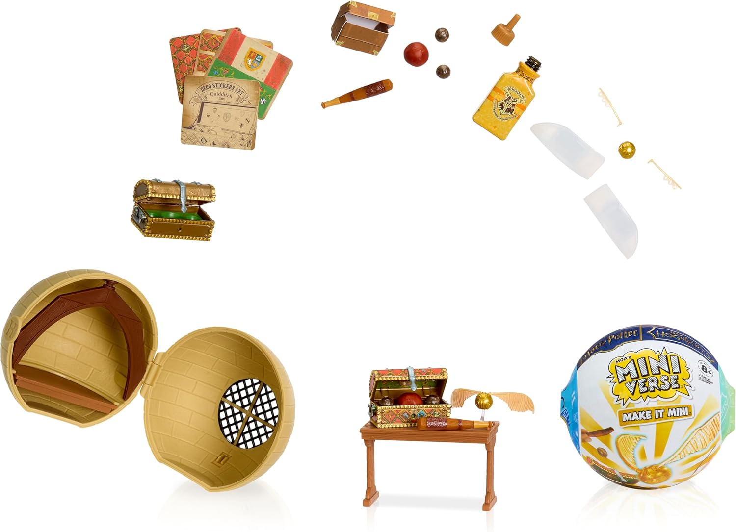 MAKE IT MINI™ Back to Hogwarts™: Make your favorite items from the Harry Potter™ films with MGA's Miniverse™ Make It Mini™ Back to Hogwarts™! All-new DIY Harry Potter™ themed replicas to make, set, display, and collect! Each pack comes with SIX surprise balls (no duplicates), each filled with realistic mini supplies and accessories to craft your favorite replica items from the Harry Potter™ film series—like a Quidditch™ Set, the Nimbus 2000™, or a Gryffindor™ Scarf! Each ball is a SURPRISE, so you won’t know which minis you have until you unbox them! There are 12 to collect in this series. Compare the contents of each ball with the included collector’s guide to see which minis you’ve got. Then, follow the instruction cards on the back of the guides to make your mini creations. Once you’ve finished creating your mini replicas, set them under the sun or use any UV Light until the resin has hardened. Once they’re set, you’ve got six magical collectibles ready to display! The ball that each mini comes in transforms into a mini classroom display—perfect for showcasing your Hogwarts™ creations! Your finished replicas aren’t the only magical finds! Each ball includes unique accessories and supplies. From Harry’s glasses to a mini Slytherin™ notebook to potting soil for the Baby Mandrakes—there are so many detailed replica accessories and packages to enhance your collection. DISCLAIMER: ALL ingredients are NOT edible and do include resin play. Not suitable for kids under 8 years of age. Adult supervision required.