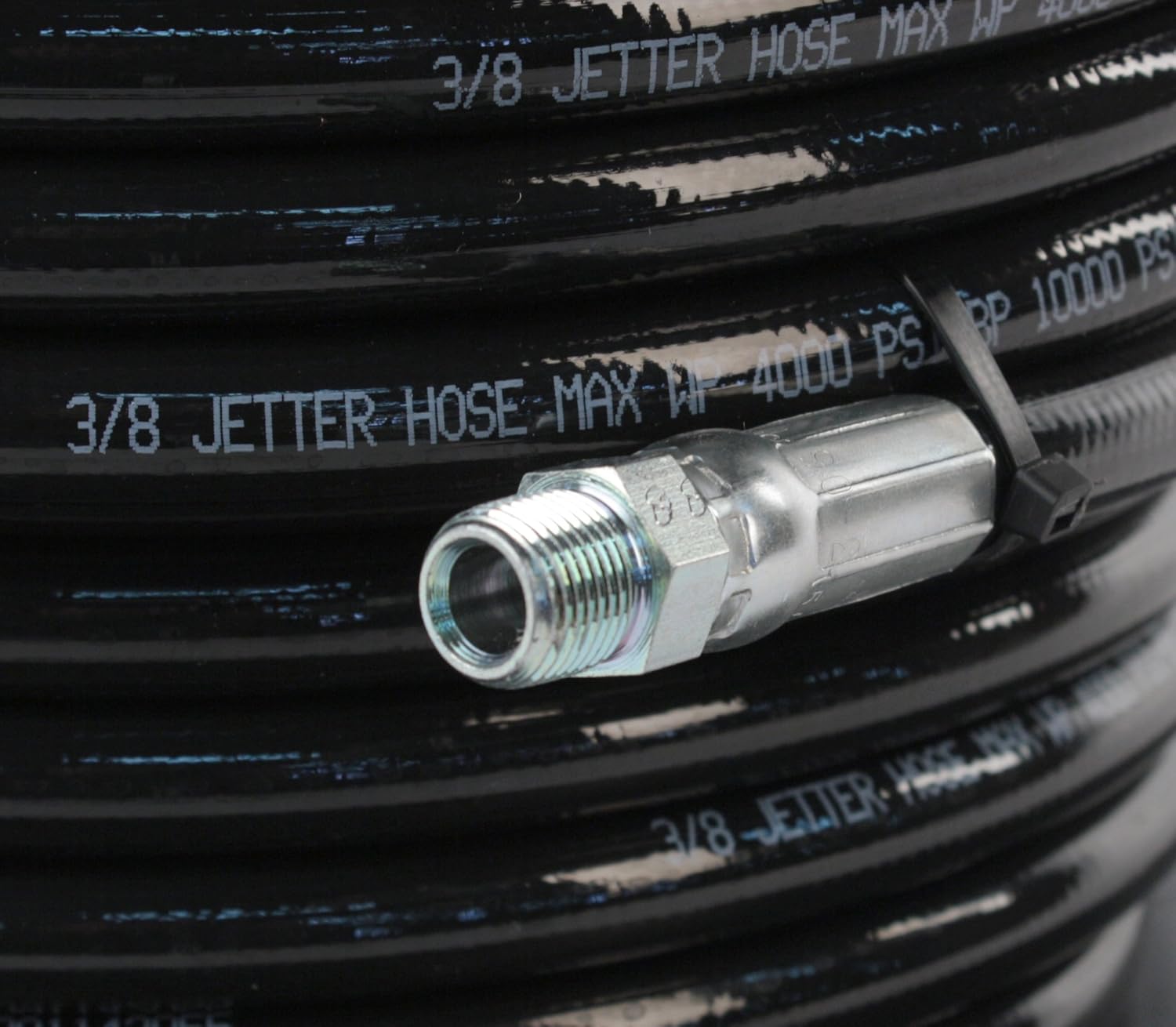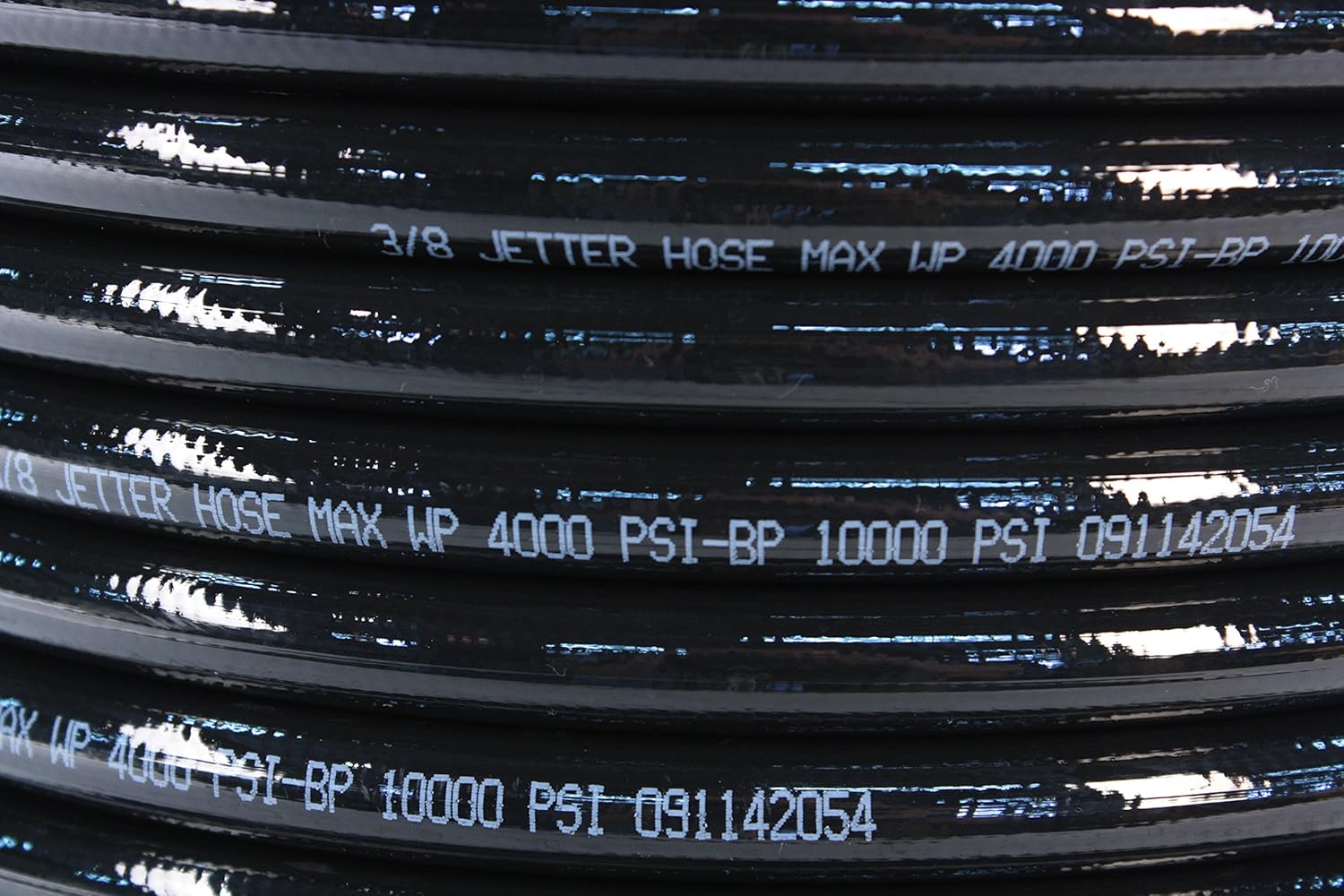 Schieffer 3/8in. x 250ft. 4000 PSI Thermoplastic Sewer Jetter Hose & 12.0 Orifice Button Nose NozzleIncludes: Schieffer 3/8" x 250' Hose 3/8" Button Nose Nozzle 12.0 Orifice Thermoplastic sewer jetter hose made in the USA for all types of medium and high-pressure jetting applications. Schieffer Sewer Jetter hose uses a reinforcement construction composed of one extra strong layer of textile braid. Schieffer uses a single pass with a twenty-four carrier braider vs two passes with a sixteen carrier braider like most of the competition. Covering the hose in a single pass keeps the layers of braiding closer and tighter together creating a stronger hose than other competitor’s hoses. Hose Construction Inner Tube: Thermoplastic polyester tube Reinforcement: One layer 3/8" high tenacity polyester textile braid that is chemically bonded Cover: Black thermoplastic polyurethane that is oil, weather, ozone, and abrasion resistant Temperature Range: -40°F / +160°F Specs: Length: 250' Connection: 3/8" MPT (swivel) x 3/8" MPT (solid) Size: DN 10 - Dash -06 Hose I.D: .41" - Hose O.D: .72" Working Pressure: 4000 PSI - 276 Bar - Proof Pressure: 4500 PSI - 310 Bar - Burst Pressure: 9000 PSI - 620 Bar Bend Radius (MIN): 4.92" Button Nose 3/8" Female 12.0 Orifice Jetter Nozzle 1 front jet at 0° that clears blockages - 3 rear jets at 33° flush out debris loosened by the front jet 3/8" Female Fitting - Fits 3/8" NPT male sewer jetter hose fittings 12.0 Orifice - 5000 PSI Max - Handles water up to 310° F