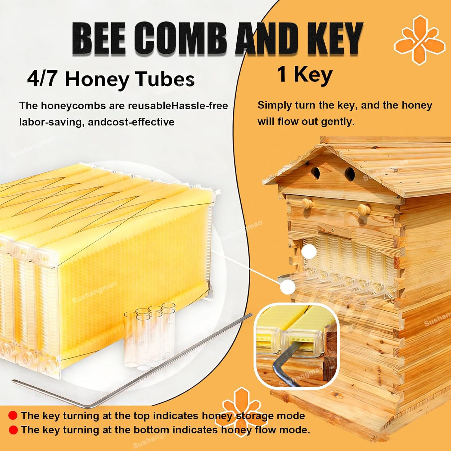 ✅Effortless Beekeeping – Just Add Bees Simply insert the key, turn it, and watch pure honey flow into your jar. No mess, no centrifuge. Complete starter kit includes self‑flowing frames (4 or 7), durable fir wood hive, observation window, and tool‑light assembly. Perfect for beginners and backyard beekeepers.✅Product Features:1.Self-Flowing Honey Harvesting — Insert the key, turn it, and honey flows out. No need to open the hive or use a centrifuge2.Large Observation Window — Watch bees build comb and store honey without disturbing the hive3.Wax-Coated Fir Wood — Kiln-dried to prevent warping and cracking for long-lasting durability4.Complete Starter Kit— Includes brood box, super box, self-flowing frames, harvest key, queen excluder, and manual5.Two Size Options — Choose 4-frame or 7-frame model to fit your space6.Holds 10,000–20,000 Bees — Ideal colony size for backyard beekeepers7.Tool-Light Assembly— Pre-drilled holes and dovetail joints for quick, easy setup8.Easy Maintenance — Simple design makes daily care effortless✅Product Specifications:Name: Self-flowing Beehive Starter KitWeight: 12.5 kg / 23 kgMaterial: Wax-coated fir woodDimensions:Brood box: 51 × 41 × 26 cm / 20.1" × 16.1" × 10.2"Super box: 51 × 41 × 25 cm / 20.1" × 16.1" × 9.8"Package Included:1 * Beehive Starter KitNotes:1. Please allow the slight color difference caused by the shooting light and 1-3cm error due to manual measurement.2. If you have any questions please contact me and I will reply you within 24 hours