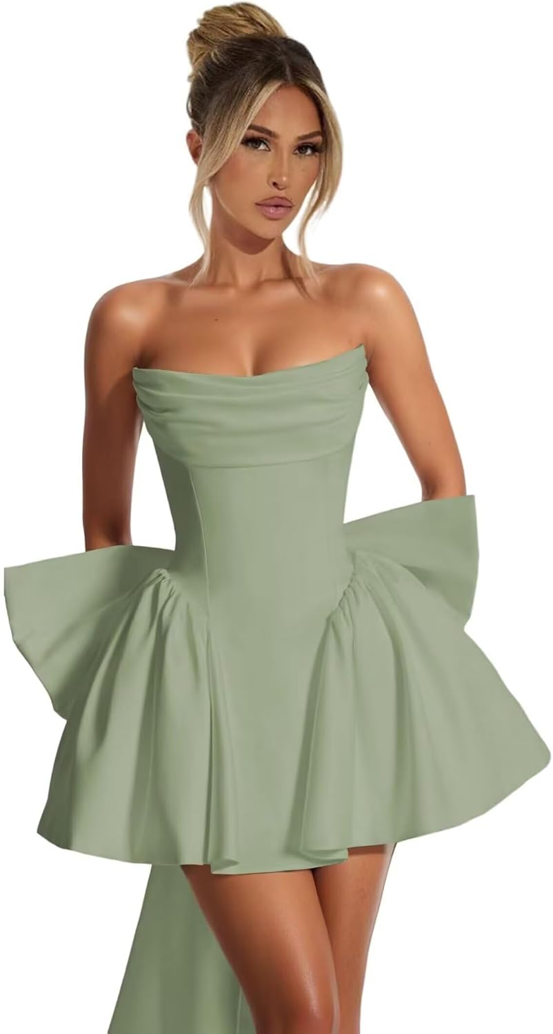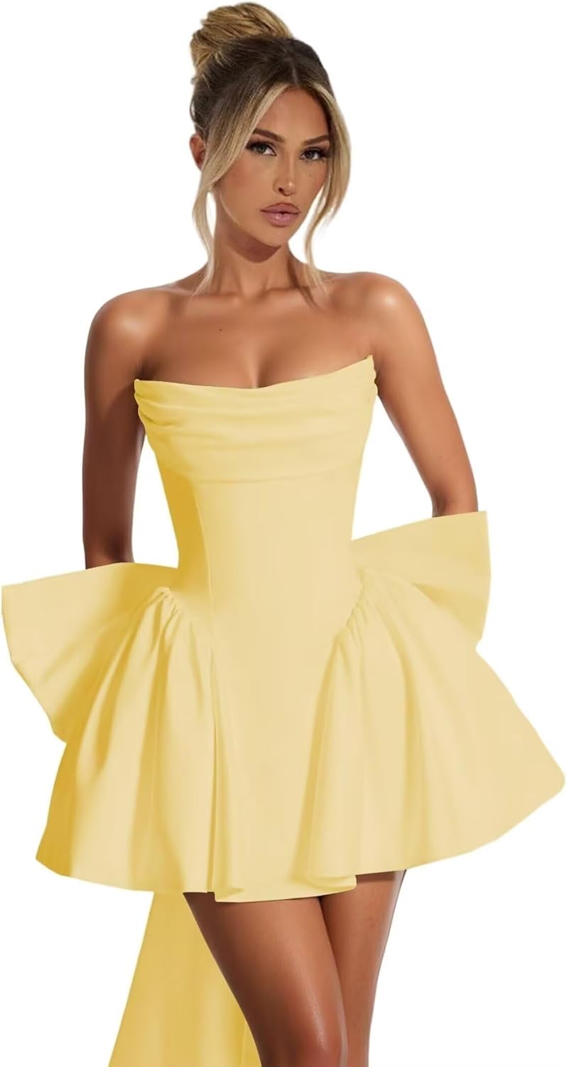 Kibbih Short Prom Dress 2026 with Bow Satin Strapless A-Line Formal Dresses for Women Cocktail Party Gown Product Details: Fabric: Satin Silhouette: A-line Neckline:Strapless Sleeve: Sleeves Hemline: Short Mini Closure: Lace-Up Back Warm Tips: It is VERY important to know how to choose a proper size for shopping online, especially formal Dress. Please check our SIZE CHART on the Left Images. To help you get the dress with perfect fit, please follow the steps below to find the correct size. ❥ Measure your waist, bust, hips and compare with our own size chart. ❥ If these measurements do not belong to one standard size, choose the bigger one. ❥ Normally, no one's figure is in exact standard size. If the dress size differs little from your own size, you could find a tailor to make a minor alteration. All our dresses come with additional fabric in the seams. ❥ If you are not sure which size you should choose, please contact us via amazon, we will provide you the best suggestion. If you want the dress to be customized, please send us the following measurements by e-mail. 1.Full Bust _____ inch or ___ cm 2.Waist _____ inch or ___ cm 3.Hips _____ inch or ___ cm 4.Hollow to floor(Shoulder to Feet without heels on) ___ inch or ___ cm 5.Height: _____inch or ___ cm 6.The height of your high heel shoes: _____inch or ___ cm 26.The date you need the dress_____ Please kindly note that the real color of the item may be slightly different from the pictures shown on the website due to camera quality and monitor settings. Any questions, please feel free to contact us.