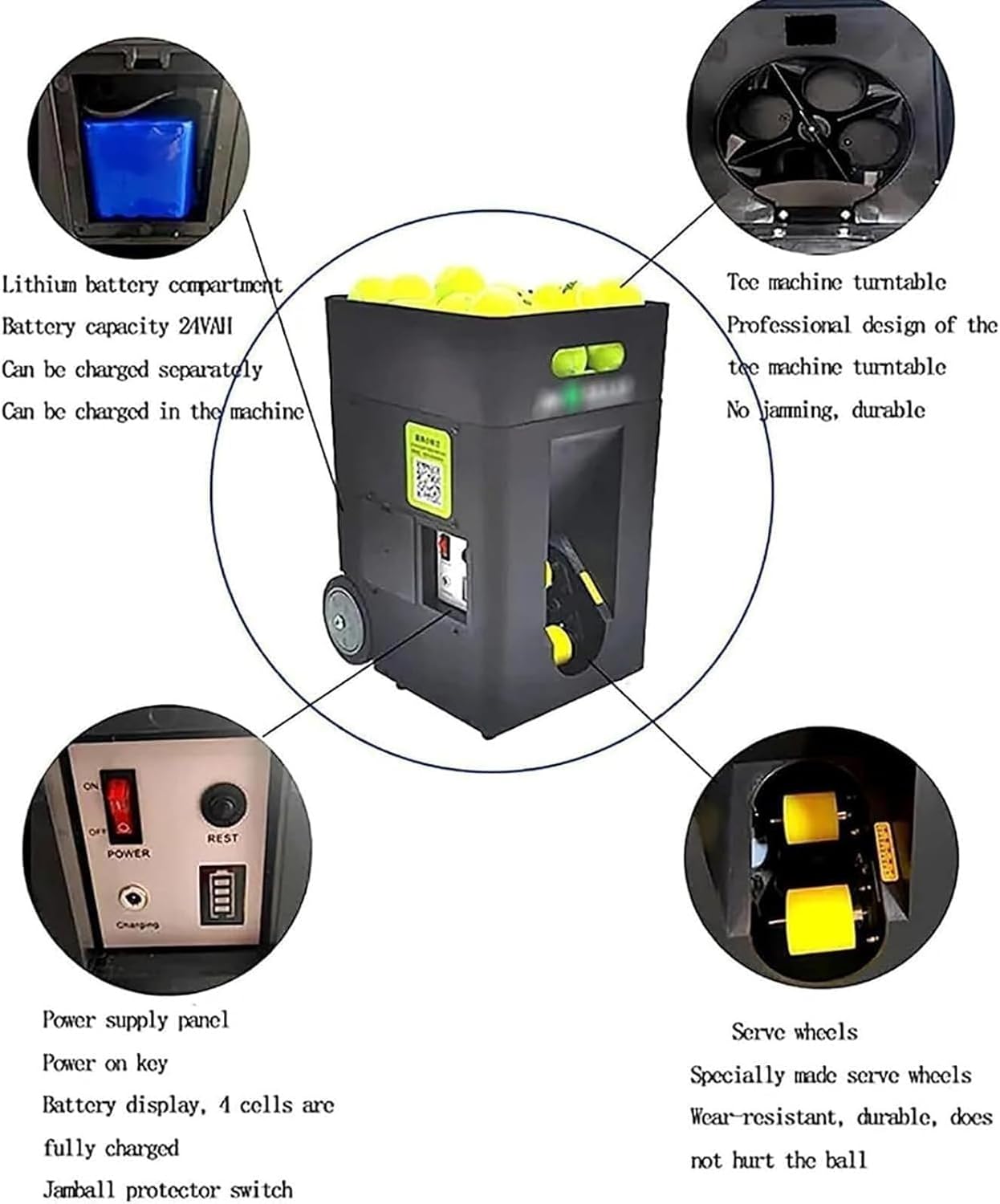 Tennis ball machine suitable or kids and beginners, simulating over 90% of ball feeding paths.It can help you improve your footwork trainings running left and right, forehand and backhand, lob, volley, can simulate most teaching scenarios.Features:The whole machine weighs only 10 kg and is equipped with a towing wheel and a pull rod.The battery compartment allows easy access to the lithium battery. It can also be loaded inside the machine.It is small in size and easy to carry. It is designed to be integrated into the machine and can be used immediately upon receipt without installation.Basic movement shaping training, advanced exercises for beginnersSpecification:Name: Tennis Ball MachineMaterial: ABSFrequency: 1.5 to 10 seconds/ballAltitude range: 20-70Battery life: 2 to 4 hoursControl mode: remote control/app.Charging voltage: 110-240VSpeed: 10-60KM/HRemote control distance: 10-12MBattery properties: 24V5AHBall capacity: 50 pieces (not included)Weight: 10 kgProduct size: 50*36*30cmThe product includes:1 x tennis ball machine