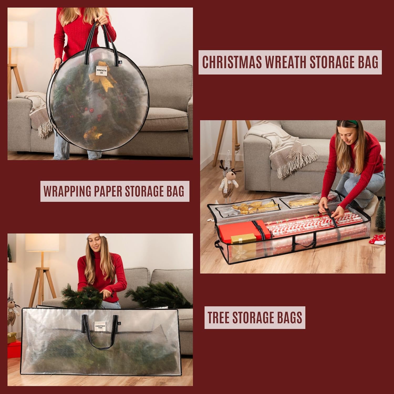 Keep your holiday decorations organized and protected year-round with our exclusive bundle! This set includes four 30" clear wreath bags, a spacious 7.5 ft Christmas tree storage bag, and a convenient gift wrapping paper storage solution. Each item is crafted from durable, clear material for easy identification and access. Perfect for maintaining the pristine condition of your festive gear!
