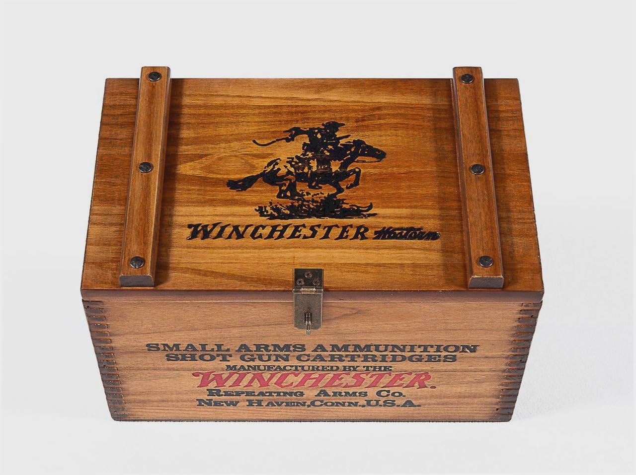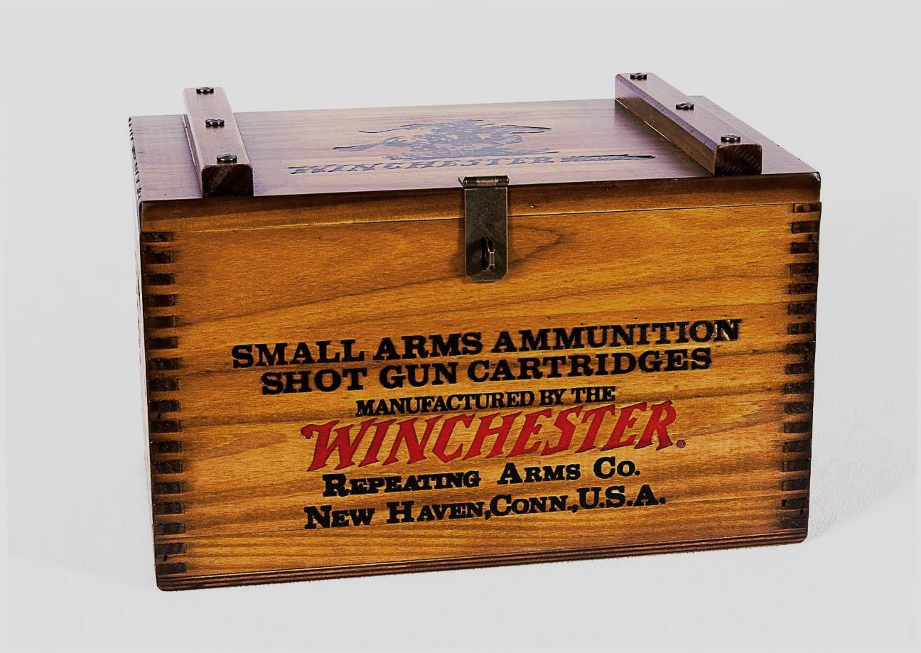Hand crafted Winchester wooden ammo box. Designed to hold 500 shells. The box is individually crafted from pine, hand sanded, distressed, sealed, shaded and lacquered for durability. Features a hinged top, and a lockable clasp. The lid, front, and ends are emboss printed with the original Winchester printing plates.