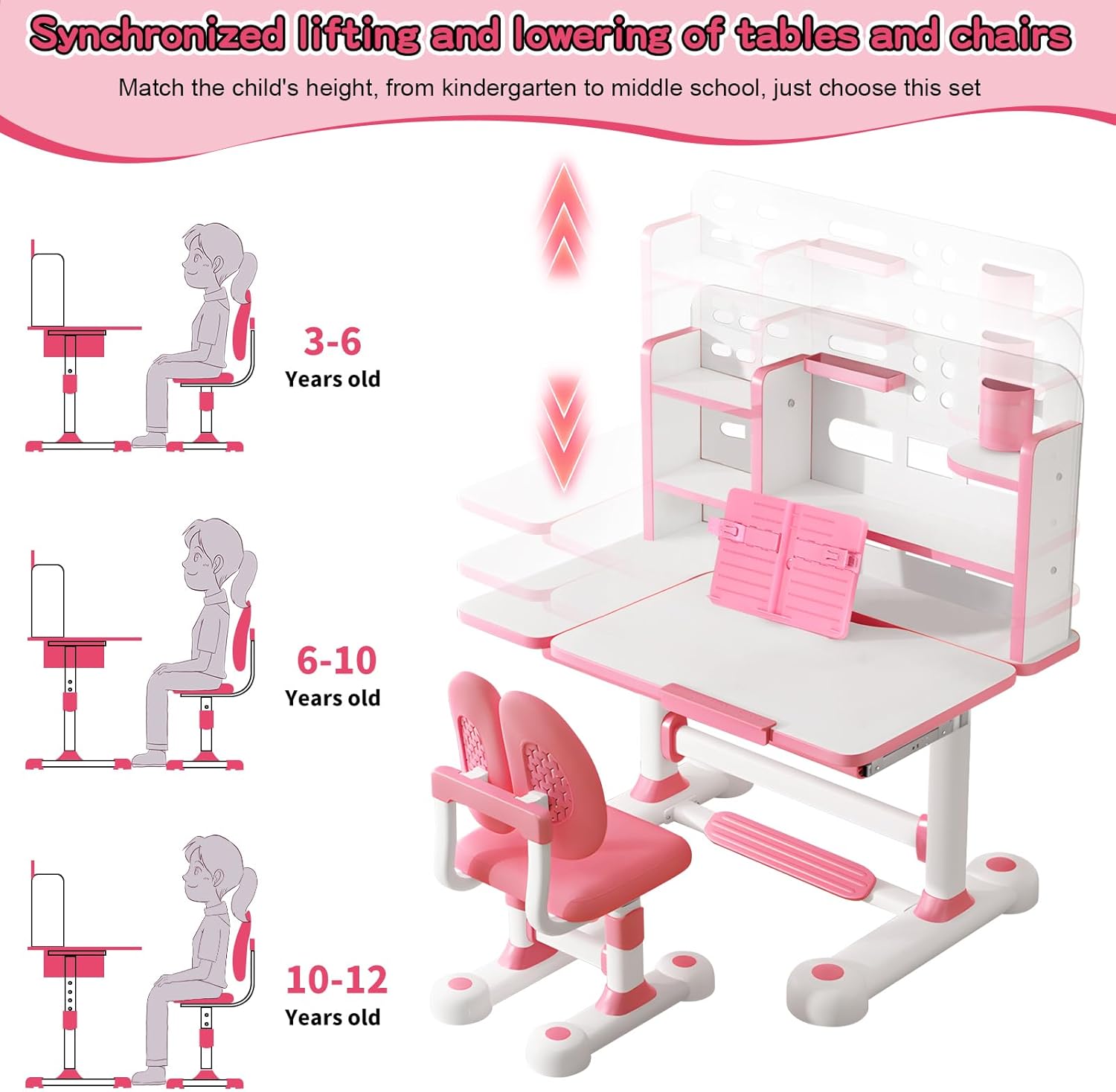 Adjustable Desktop Tilt for Comfort: Our smaller desktop features an adjustable tilt range from 0-degree to 50-degree, allowing your child to paint and use the computer with ease and comfort. Perfect for hours of creative play and learning. Spacious Writing Area for All Needs: Our desk offers ample writing space, perfect for accommodating all your child's needs. With smart compartmentalized sections, stationery stay organized and within reach, simplifying homework and creative projects. Durable and Sturdy: This table and chair set is made of high-quality fiberboard and sturdy metal frame, which is durable and long-lasting. It can withstand daily use and provide reliable support every day, whether your child is studying or playing. Flexible Height Adjustment: Easily adjust the desk and chair heights to cater to your child's growth. Parents can modify them effortlessly, ensuring a comfortable and supportive learning posture at all times. Large Storage Space and Comfortable Sitting Experience: Our desk features a spacious drawer to neatly store all learning tools, ensuring a tidy table that makes it easier for your child to focus on homework and activities. Plus, the ergonomically designed tables and chairs provide stable support, keeping children's backs healthy and comfortable during prolonged sitting.Item Name: Study Desk And Chair Material: Plate, Metal Features: Spacious Writing Area, Large Storage Space, Height Adjustable Desk Load Capacity: Approximately 300kg Desktop Tilt Angle: 0-Degree to 50-Degree Size Details: Desk, Size: 119cm x 80cm x 56cm/46.85" x 31.5" x 22.05" (Approx.) Chair, Size: 48cm x 38cm x 37cm/18.9" x 14.96" x 14.57" (Approx.)Notes: Due to the light and screen setting difference, the item's color may be slightly different from the pictures. Please allow slight dimension difference due to different manual measurement.Package Includes: 1 x Children's Study Table 1 x Children's Study Chair 1 x Instruction